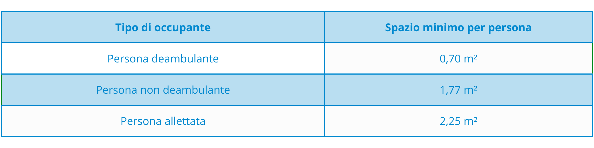 A questa superficie minima va aggiunto lo spazio necessario per la manovra degli ausili alla mobilità. Si può inoltre prevedere la presenza di elementi a supporto delle persone occupanti, come ausili all’esodo e indicazioni sui comportamenti da tenere in attesa dei soccorsi.
